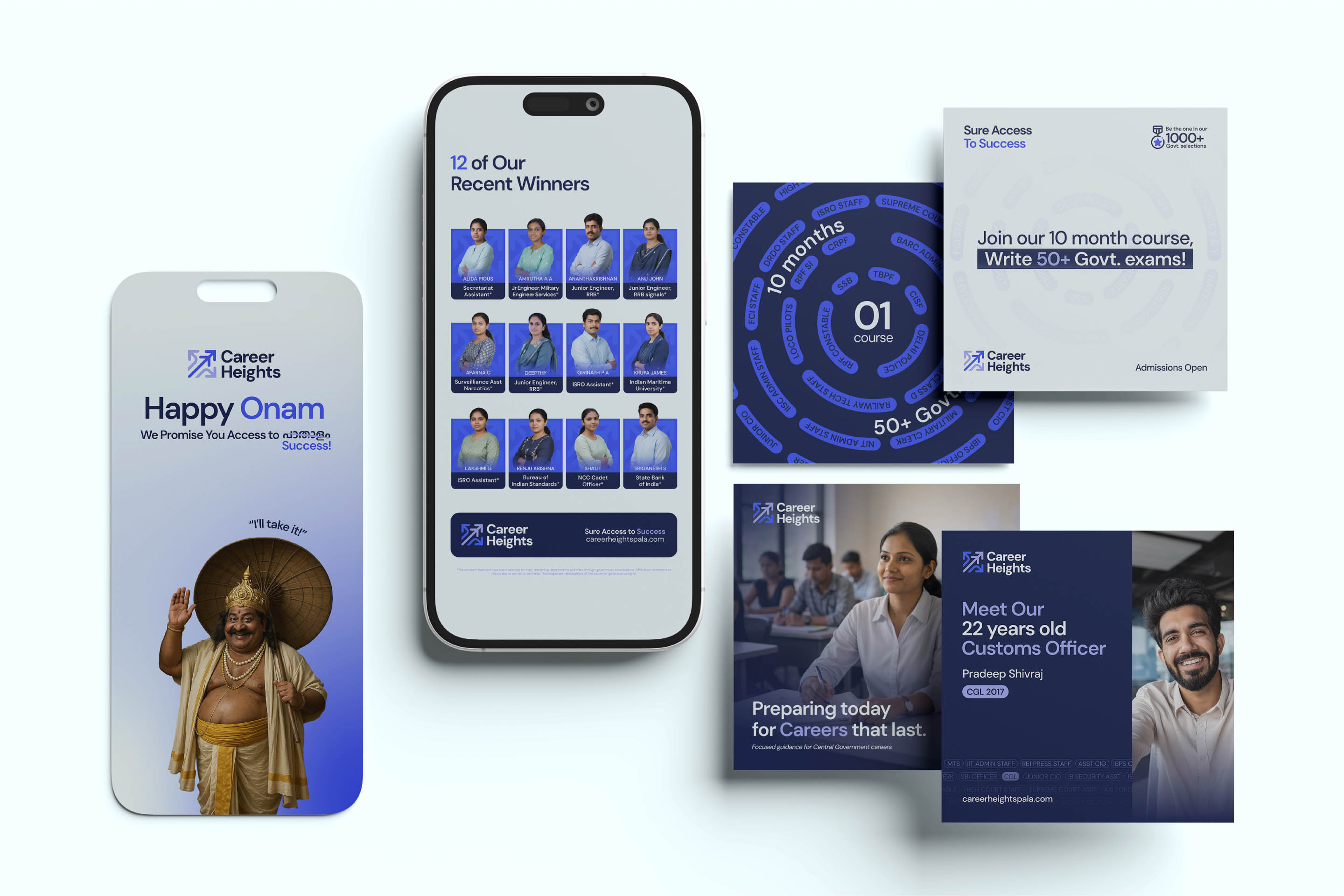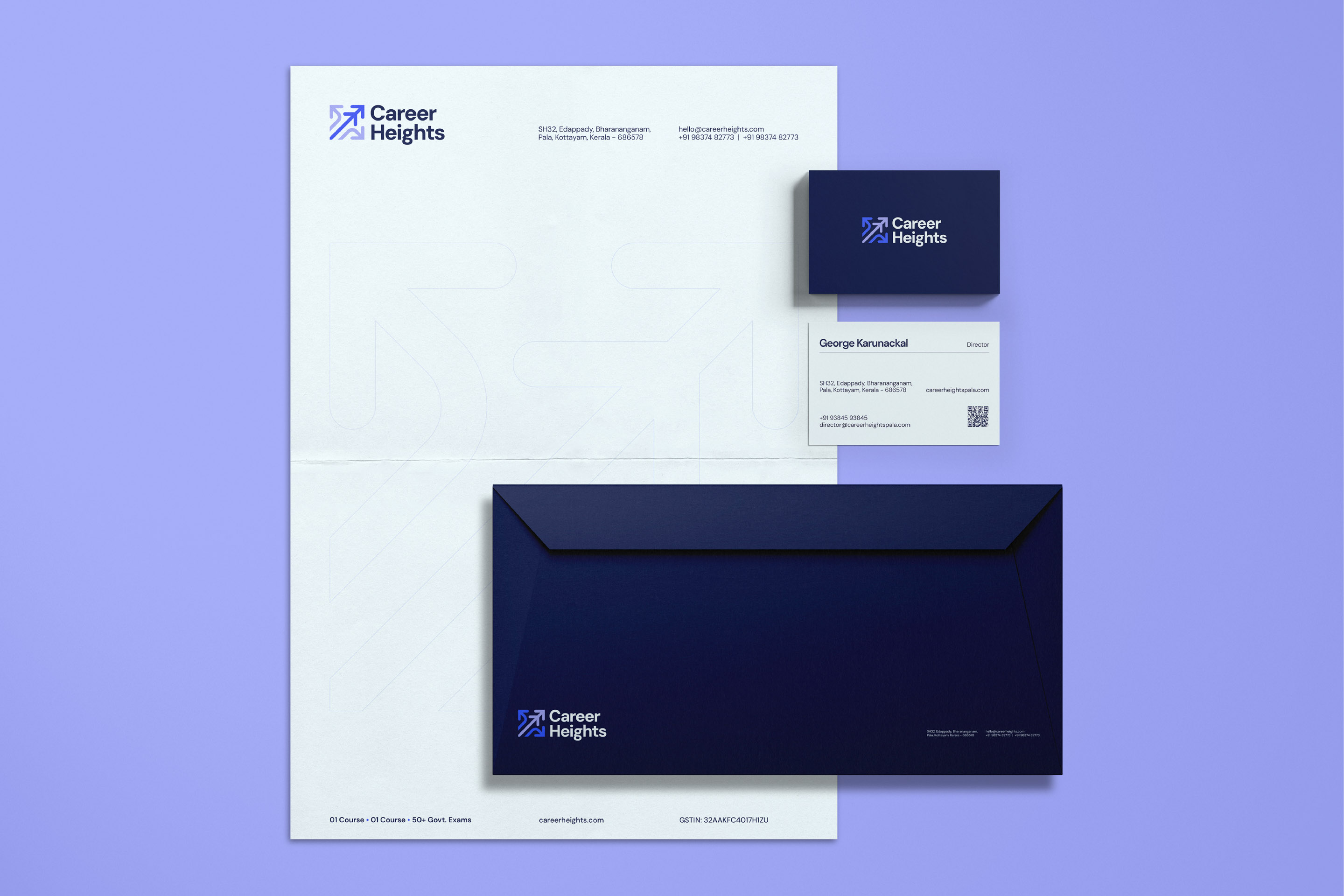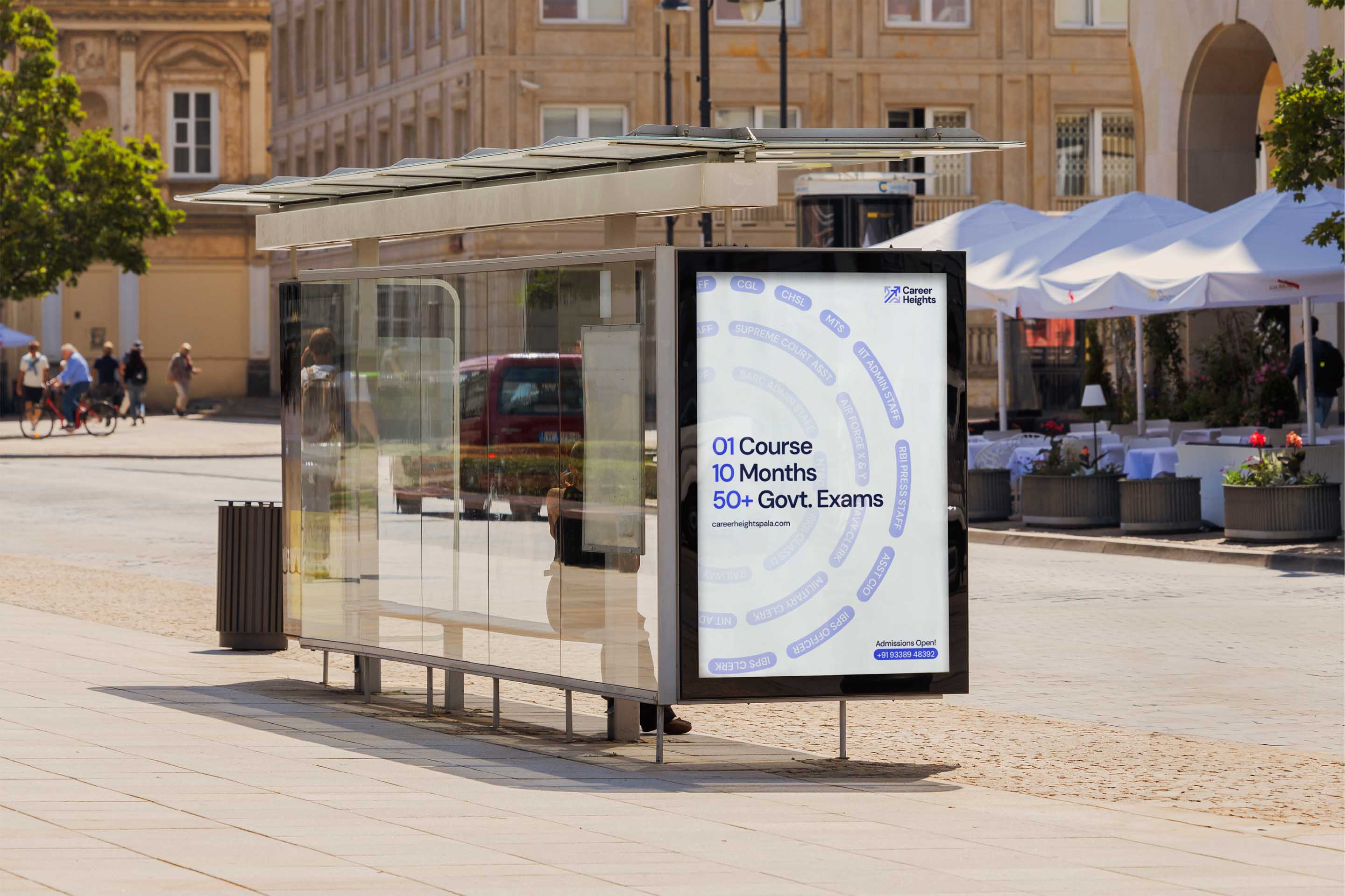 We redefined the value proposition first: 1 Course. 10 Months. 50+ Govt. Exams. Then we rebuilt the visual identity. The new logo is clean, structured, and digitally functional. The colour palette balances youthful energy with institutional professionalism. We created a circular pattern built from the names of popular exams, visually communicating the coherent system Career Heights offers. The full scope included logo and identity redesign, value proposition rework, website design, social media templates, institutional signage, and stationery. Career Heights now looks like what it is: a credible institution with a system that works.