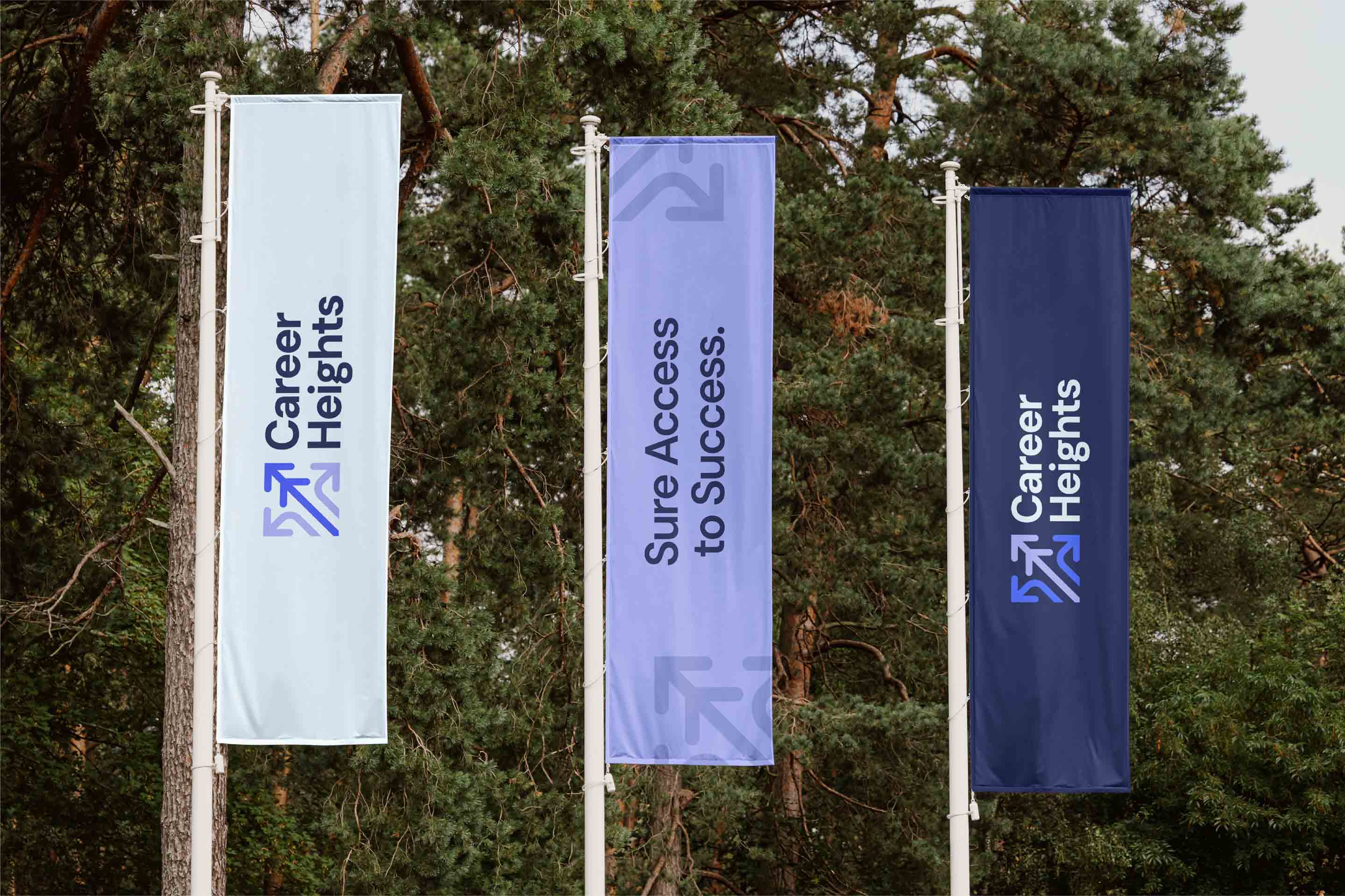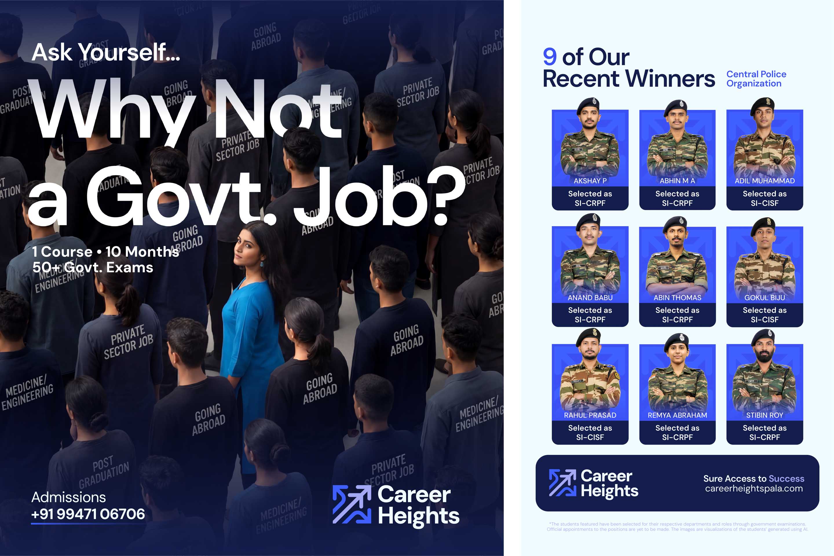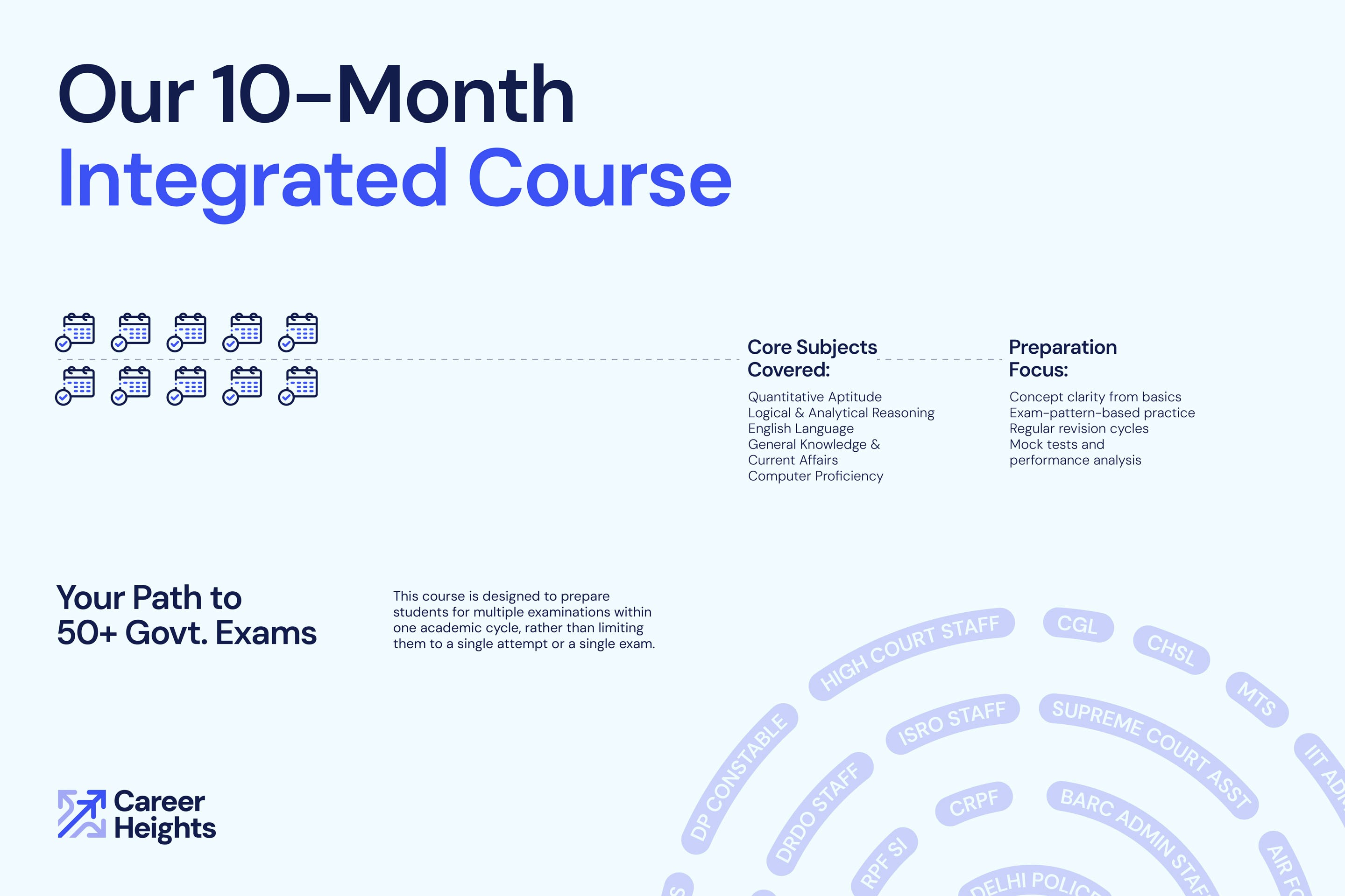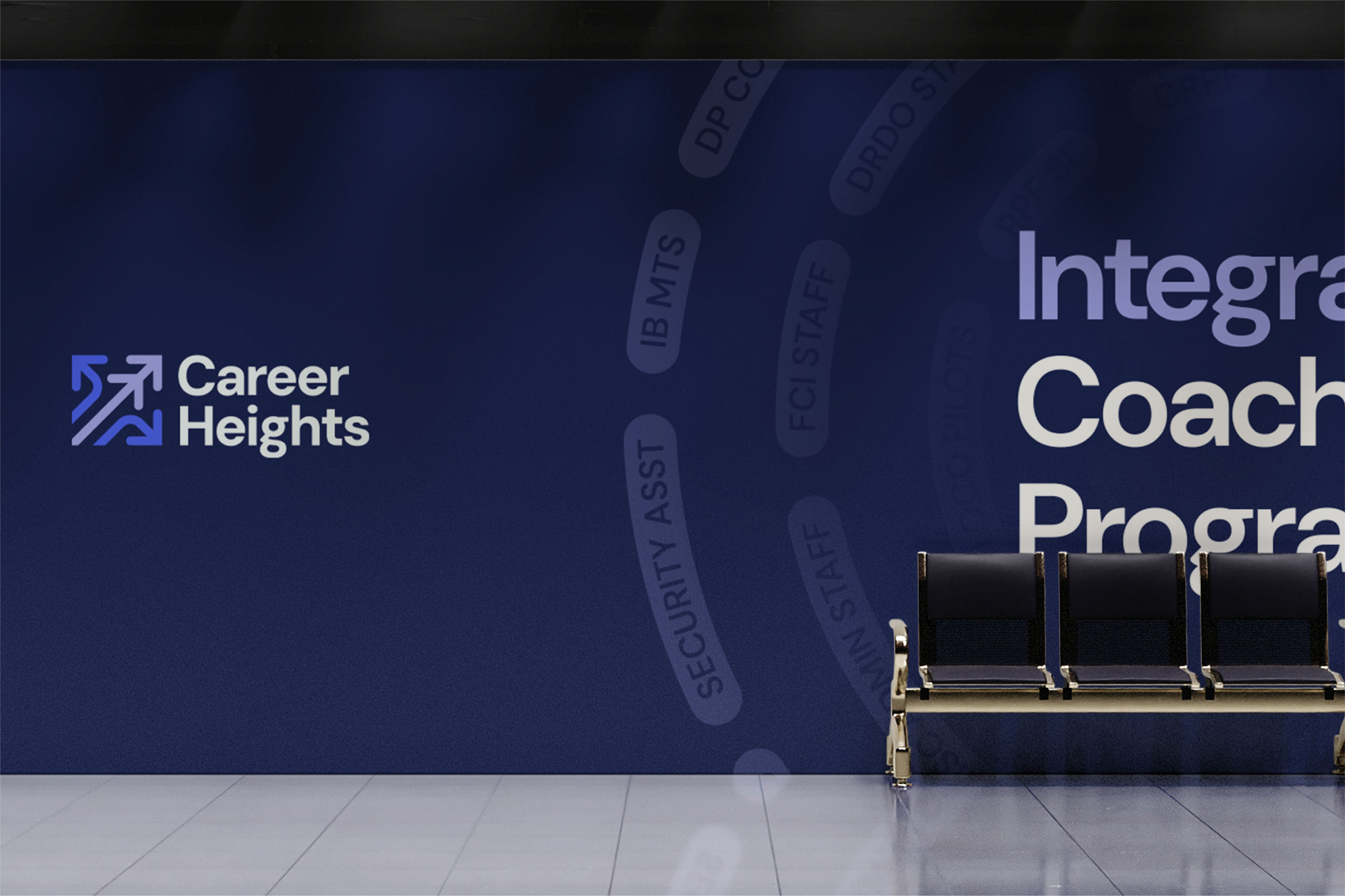 We redefined the value proposition first: 1 Course. 10 Months. 50+ Govt. Exams. Then we rebuilt the visual identity. The new logo is clean, structured, and digitally functional. The colour palette balances youthful energy with institutional professionalism. We created a circular pattern built from the names of popular exams, visually communicating the coherent system Career Heights offers. The full scope included logo and identity redesign, value proposition rework, website design, social media templates, institutional signage, and stationery. Career Heights now looks like what it is: a credible institution with a system that works.