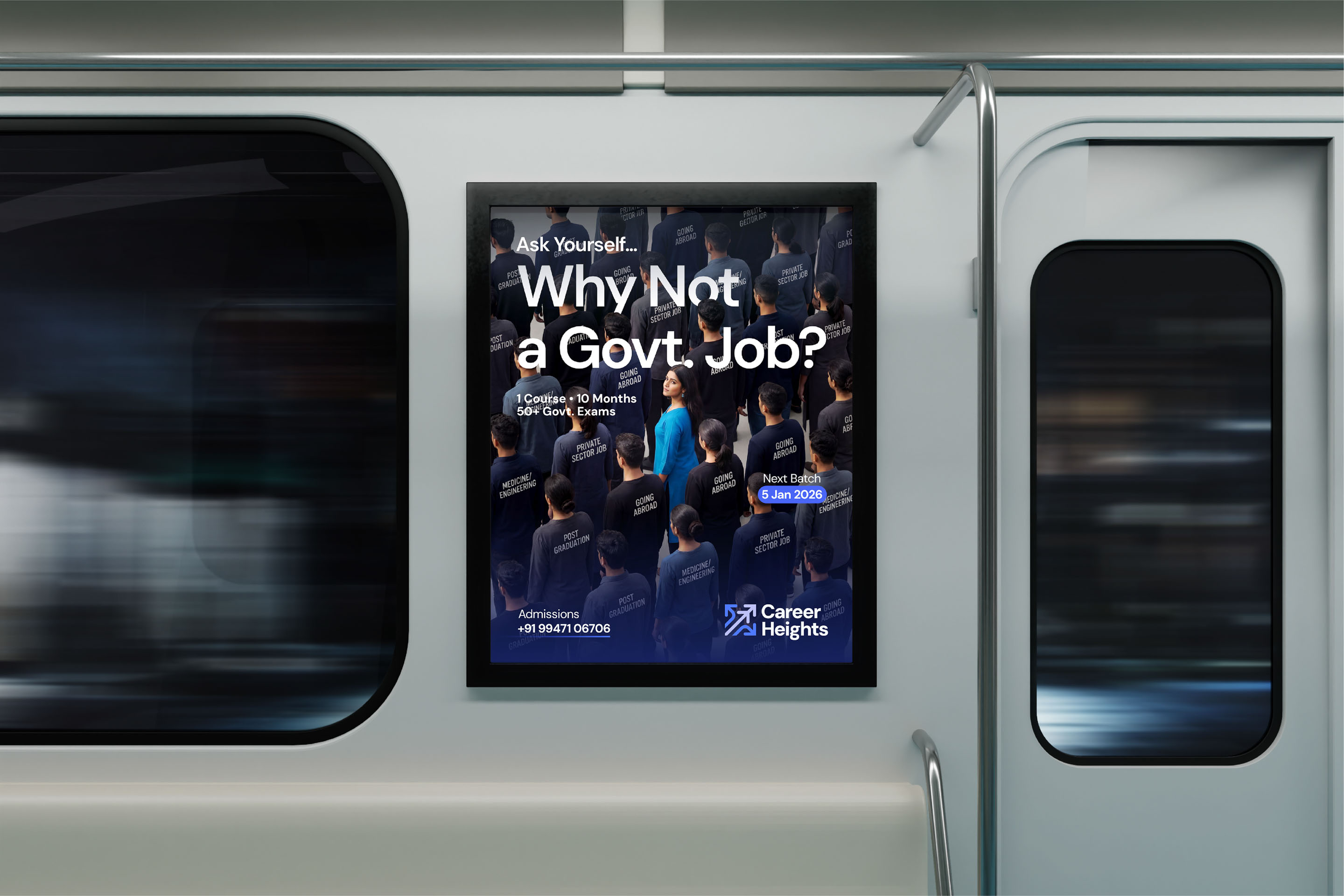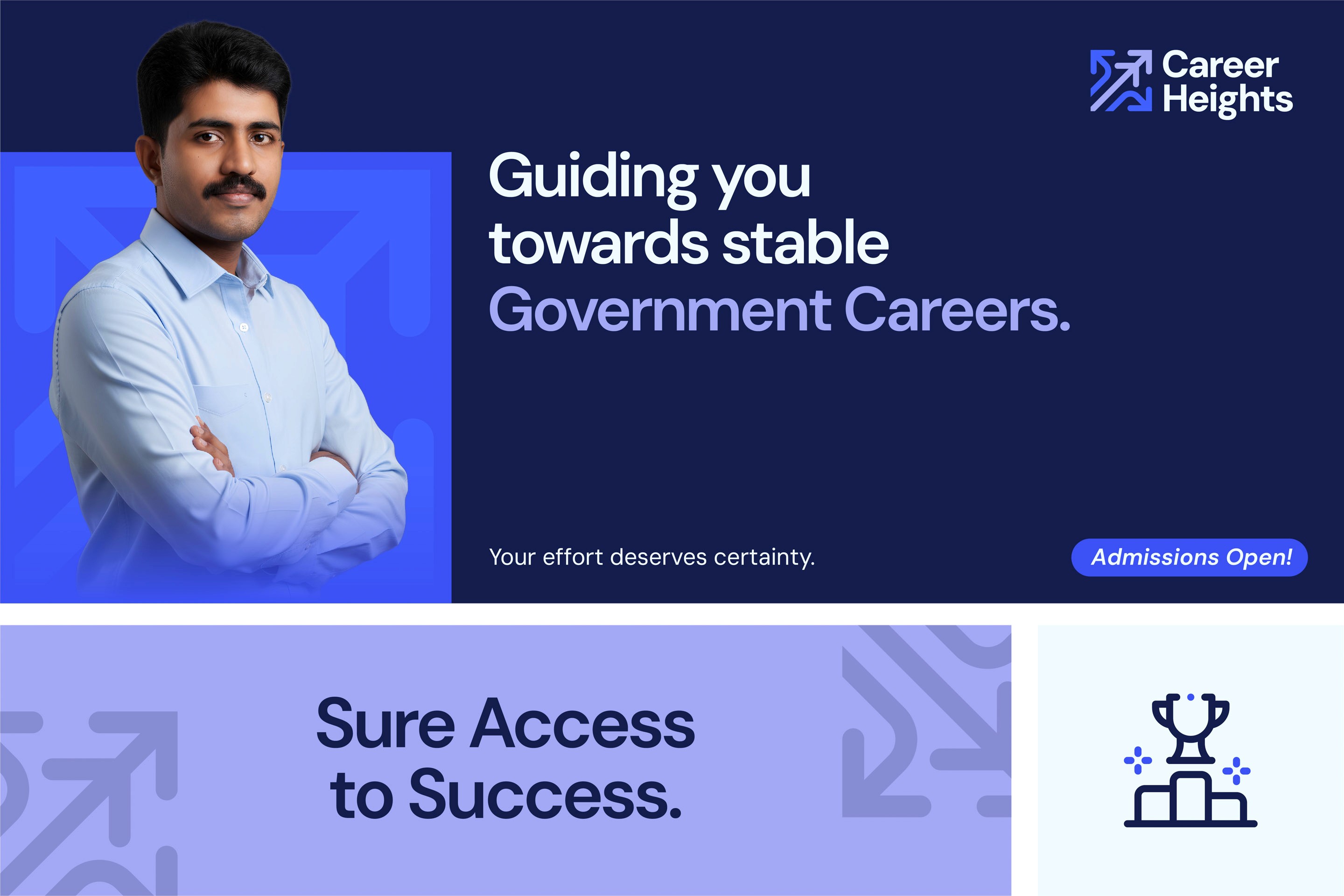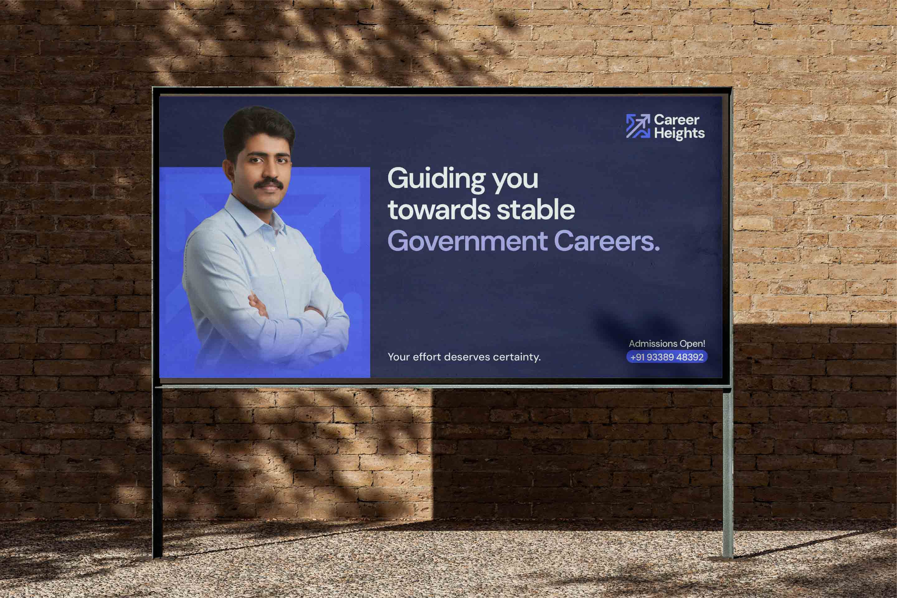 The challenge was clarity. Career Heights had a unique offering that no competitor could match: one integrated course covering 50+ central government exams over 10 months. But the brand did not communicate that. The visual identity was chaotic. The messaging was vague. The logo could not function in digital or print contexts. Prospective students between 18 and 27 needed to see an institution they could trust, not a coaching shop trying to look serious.