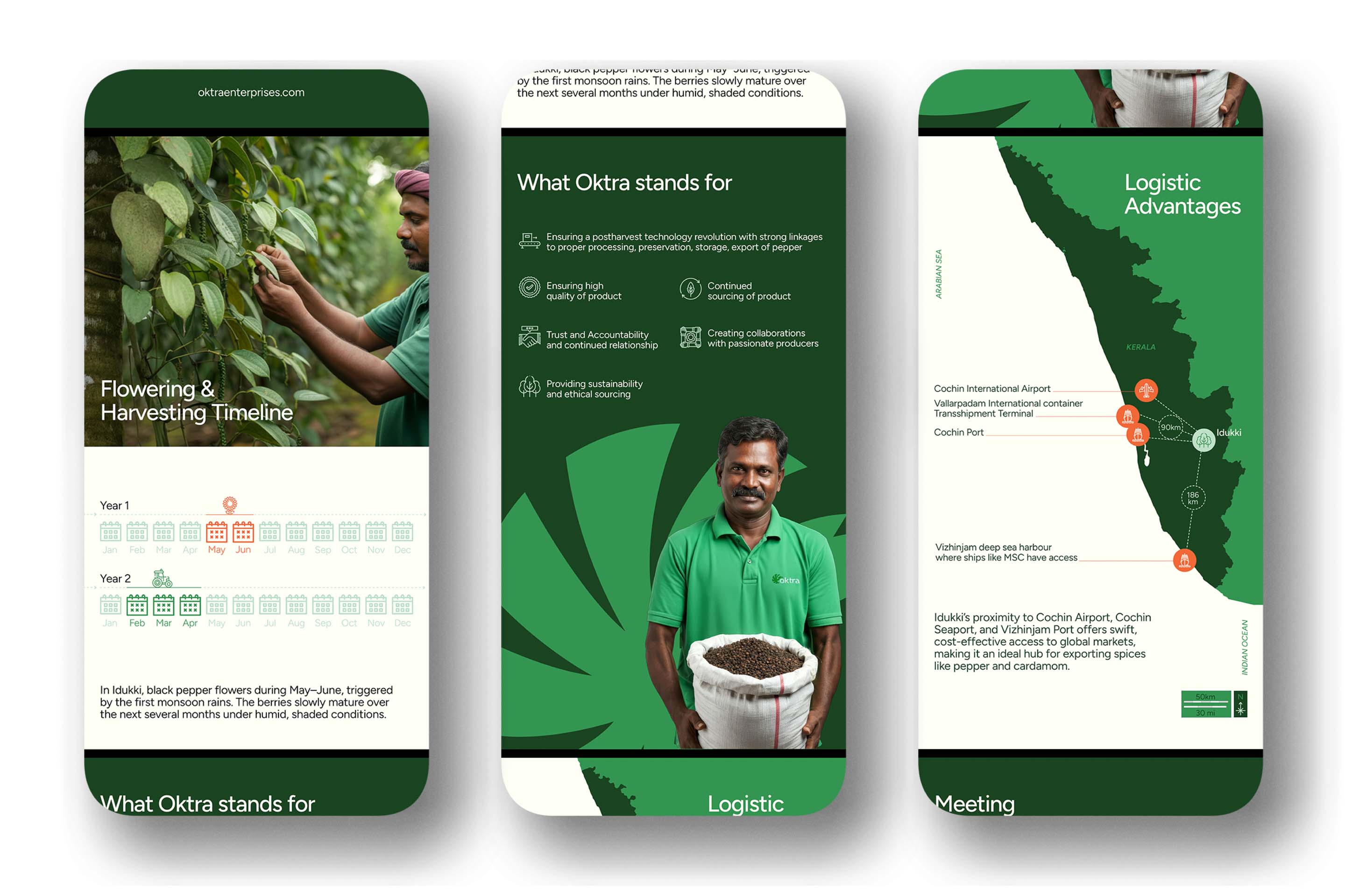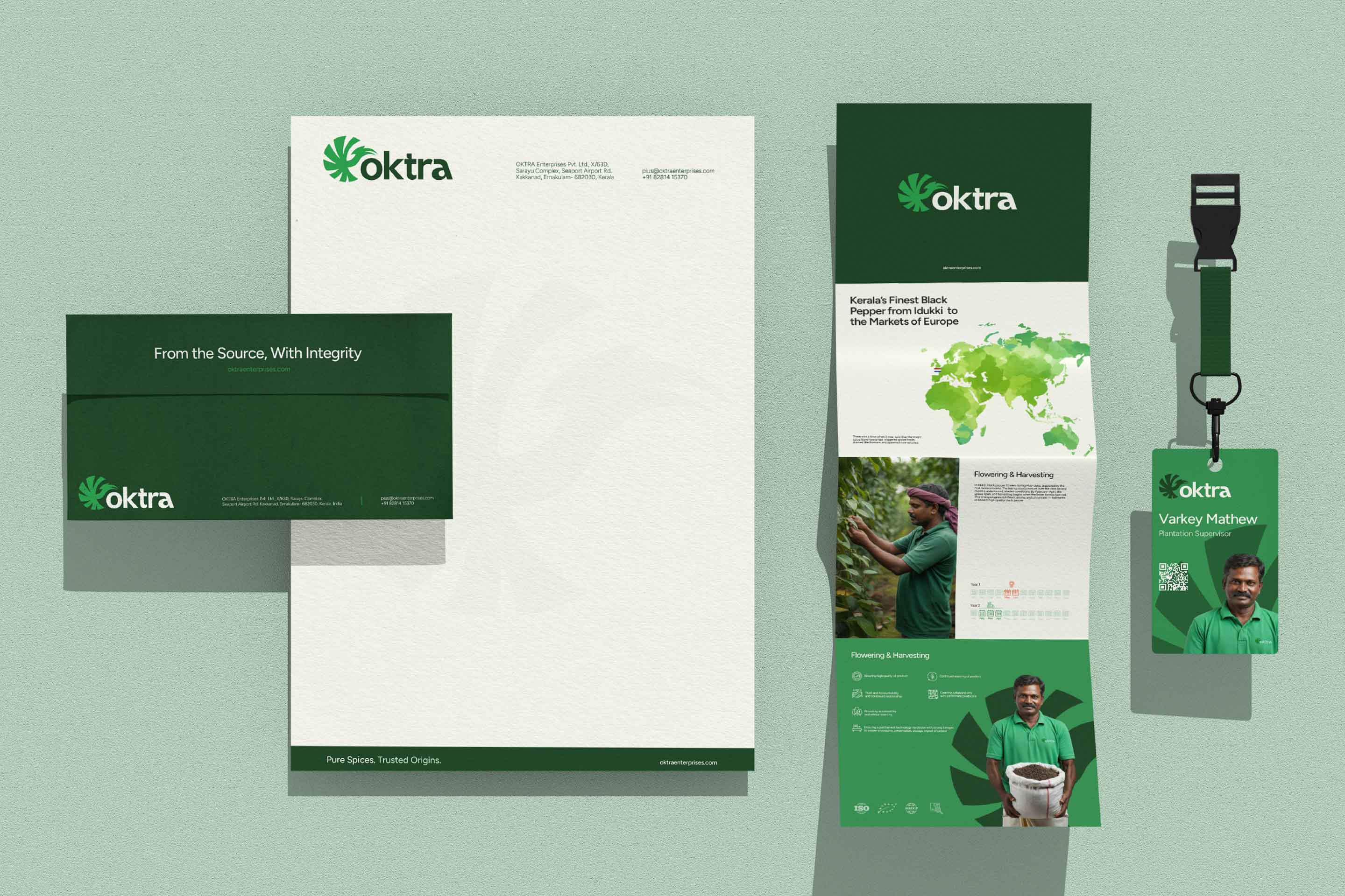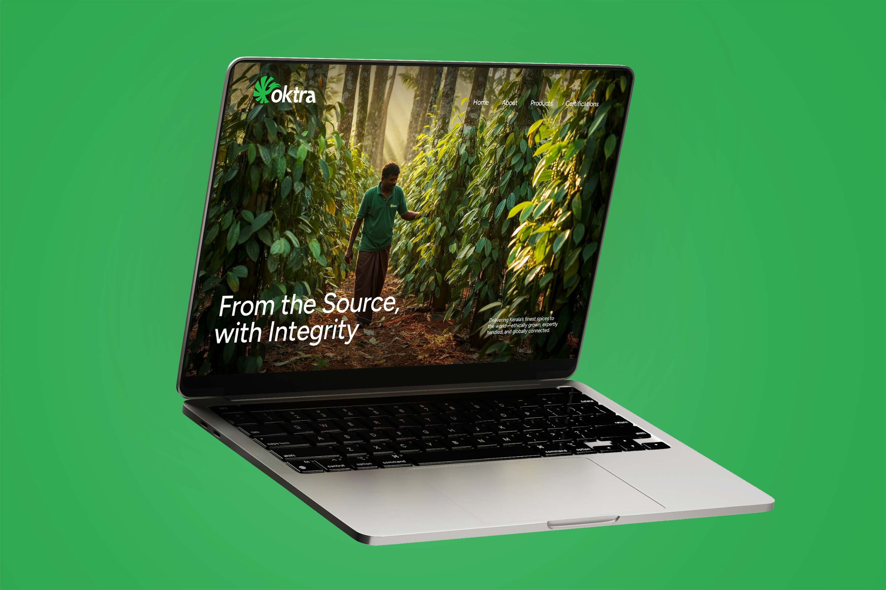 The positioning line, "From the Source, With Integrity," distills the brand promise. The identity was designed to communicate transparency before a sales conversation begins. Photography focuses on farmers, harvest cycles, and supply chain logistics. The corporate profile maps Oktra's logistic advantages from Kerala's proximity to major ports and airports, certification standards, and sourcing ethics. The website opens with "Delivering Kerala's finest spices to the world—ethically grown, expertly handled, and globally connected." Trust is established in the first frame. The brand now filters clients. Buyers evaluating on price alone go elsewhere. Buyers evaluating on trust, certification, and sourcing ethics stay.