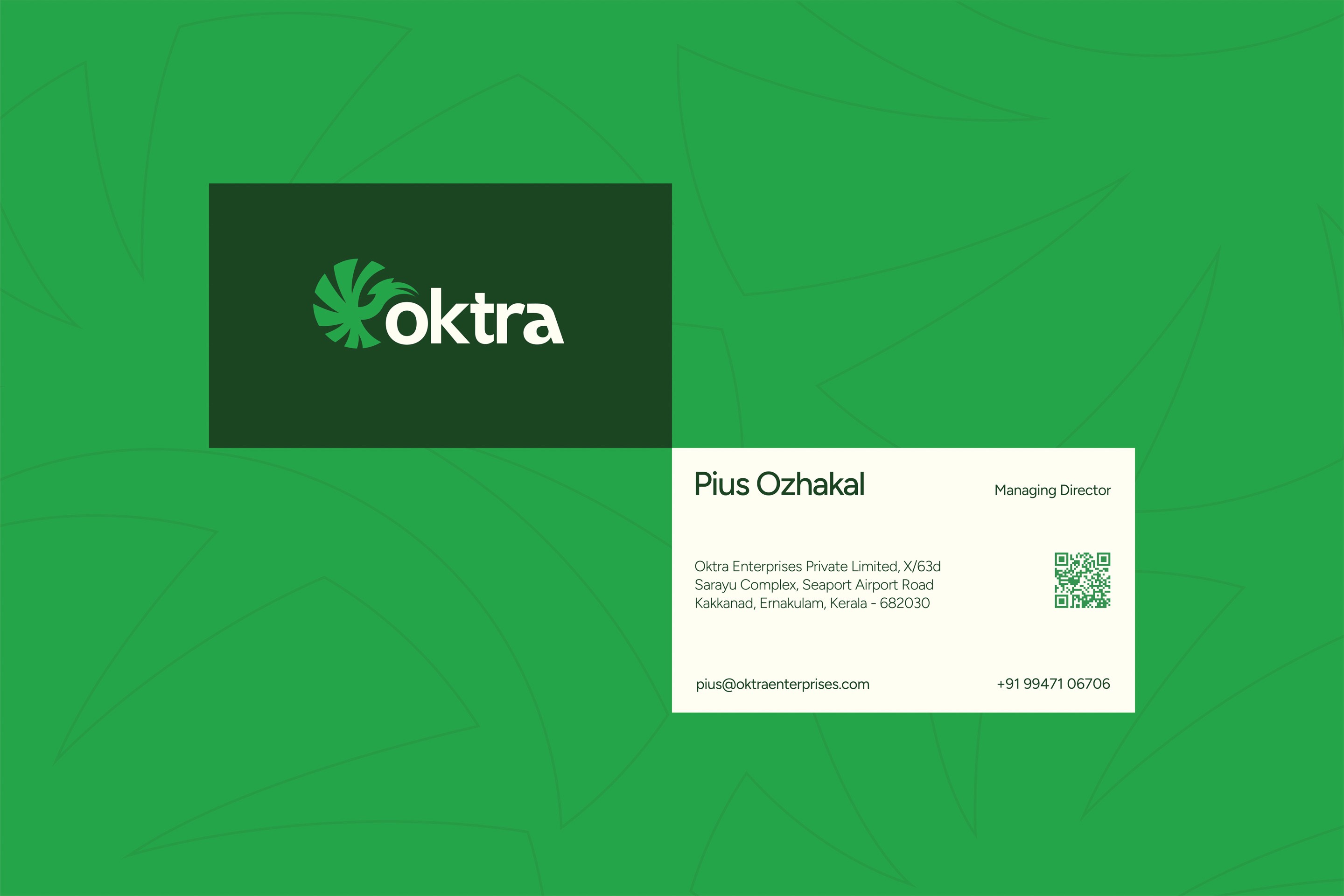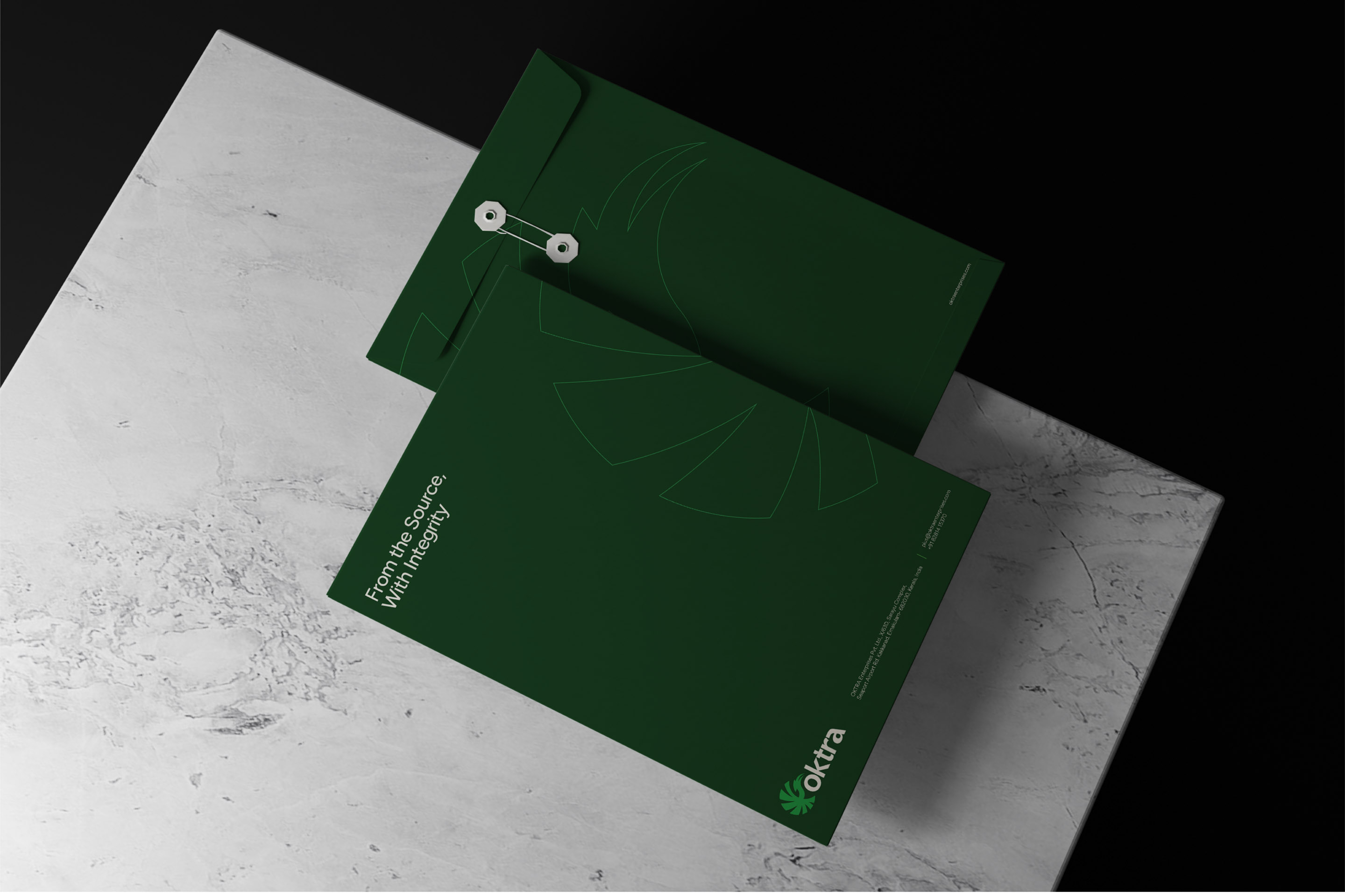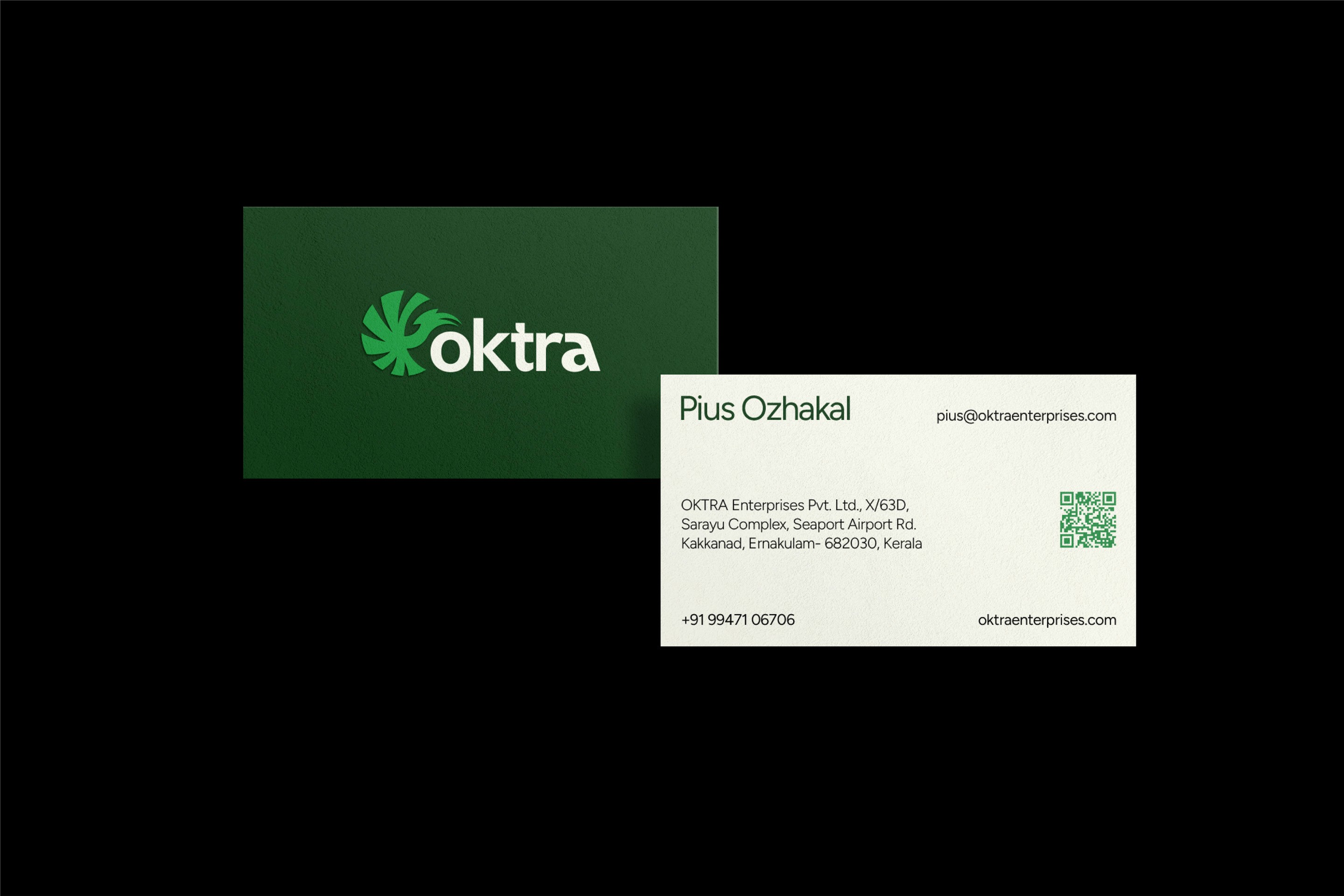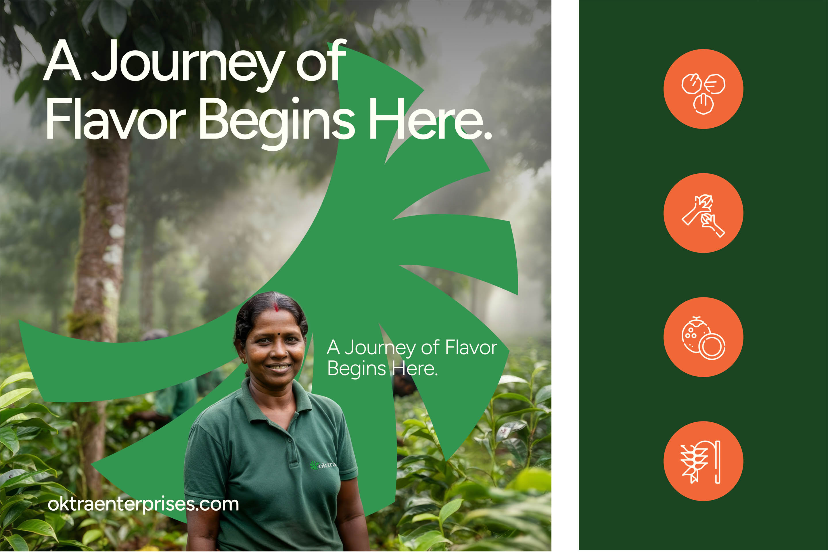 The positioning line, "From the Source, With Integrity," distills the brand promise. The identity was designed to communicate transparency before a sales conversation begins. Photography focuses on farmers, harvest cycles, and supply chain logistics. The corporate profile maps Oktra's logistic advantages from Kerala's proximity to major ports and airports, certification standards, and sourcing ethics. The website opens with "Delivering Kerala's finest spices to the world—ethically grown, expertly handled, and globally connected." Trust is established in the first frame. The brand now filters clients. Buyers evaluating on price alone go elsewhere. Buyers evaluating on trust, certification, and sourcing ethics stay.