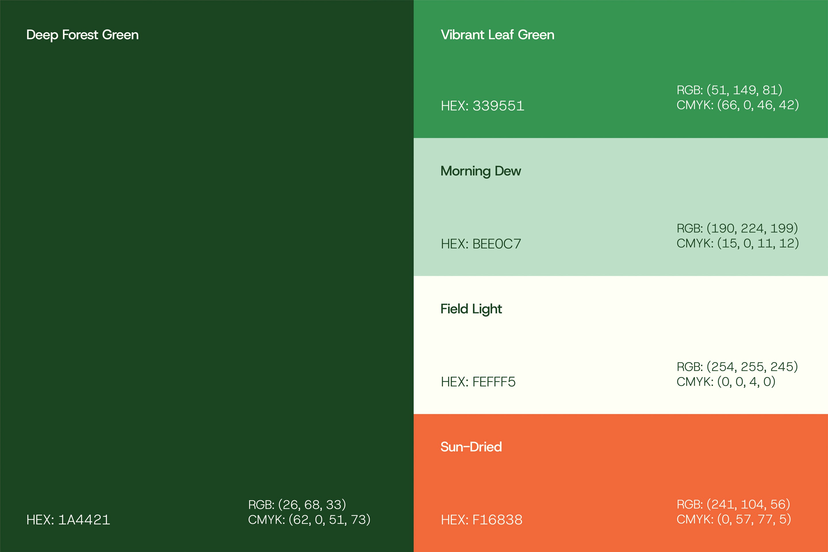 The palette is anchored in Kerala's landscape. Deep forest green signals origin and authenticity. This is the brand's foundation colour. Vibrant leaf green brings energy to the hornbill mark and highlights key information across digital and print. Sun-Dried, a warm coral orange, functions as the primary accent. It injects warmth and directs attention without overwhelming the green foundation. Morning Dew and Field Light provide neutral space. They create breathing room in layouts without diluting the visual intensity of the greens.
